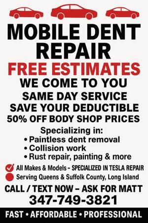 Tired of body shop prices? I fix dents, scratches, and paint damage right at your location — fast, affordable, and professional.