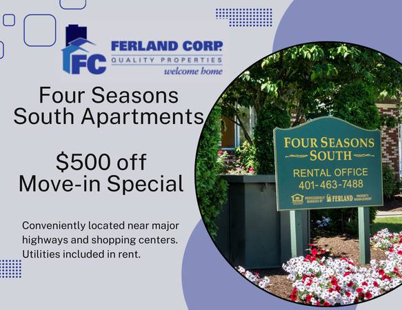 Spacious and comfortable 2 bedroom, 1 bathroom apartments available at Four Seasons South in Warwick. Enjoy the convenience of suburban living just 10 minutes from downtown Providence. Located near shopping centers, public transportation, schools, and entertainment. Quick access to Routes 95 and 295 makes commuting easy—whether you're heading to Providence, Narragansett, or Newport.
