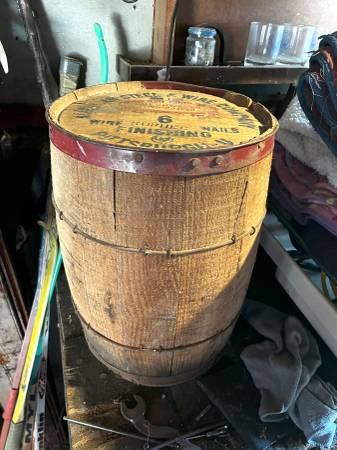 Vintage wooden wire braided nail keg. Keg is full (100 lbs) of #6 hot galvanized finish nails. Stamped "American Steel & Wire Company - Pittsburg. The keg has never been opened. (1935-1950)