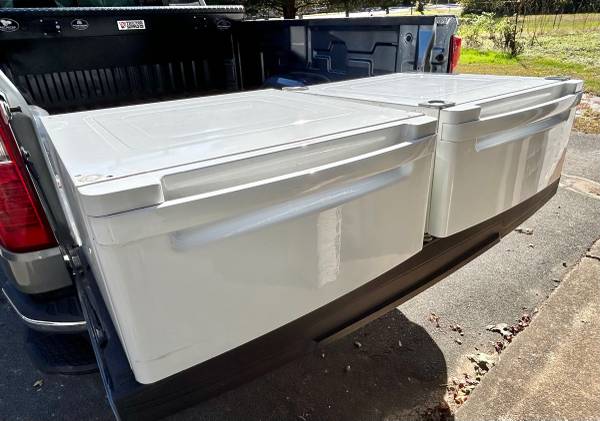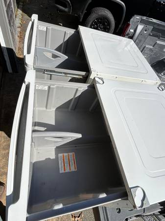 I have two used washer and dryerpedestals that are 27” wide and have a total depth of 28-1/2”. Both of these had LG machines on them but will you can put any machine that will fit on top. Only selling what you see in pics. Selling as a pair. For more info text or call show contact info
