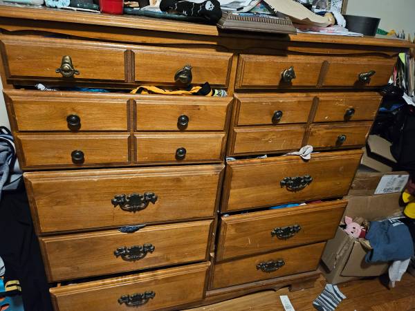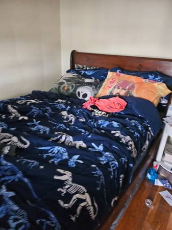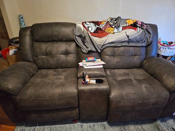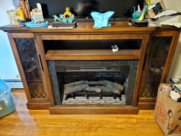 Electric fireplace will hold 75 inch tv Couch black reclines and rocks Dresser Sleigh bed full size Storage bench Can send pictures