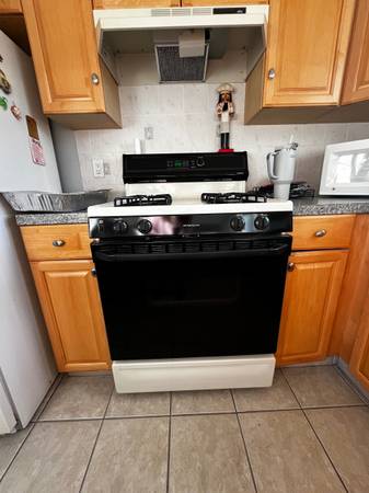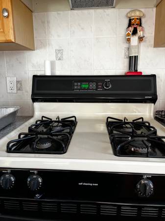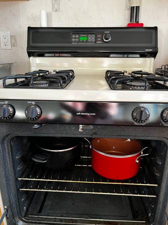 Almond/black color gas stove in good, clean condition that works great. Standard stove size 30 inches wide.