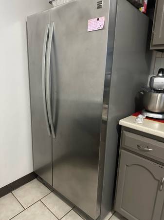 Stainless steel Kenmore refrigerator. The freezer works well. The refrigerator side needs repair. Ideal for anyone handy or looking for a garage or basement appliance. With a simple repair, you’ll have a full stainless steel fridge for a very low price.