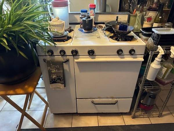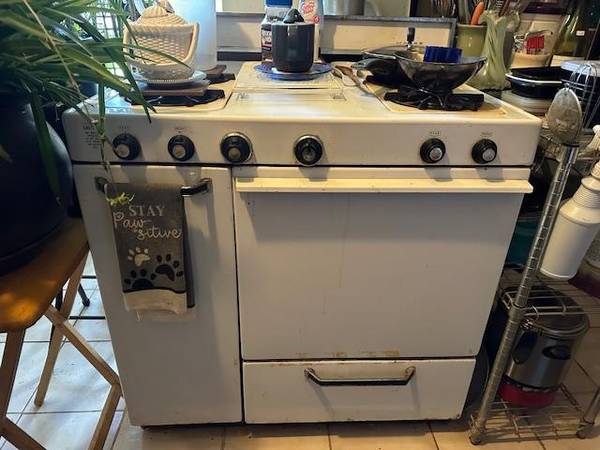 White Magee gas on gas stove and heater. Left hand burner. I installed a new heating system and no longer need it. It is still hooked up. Call 401-three three eight 5171.