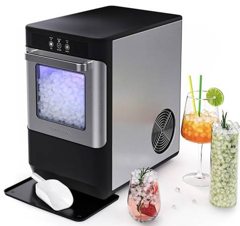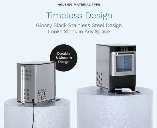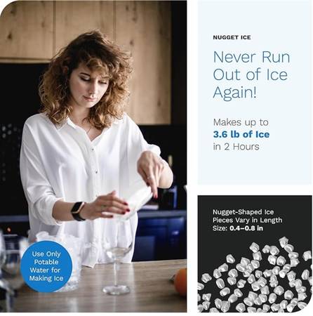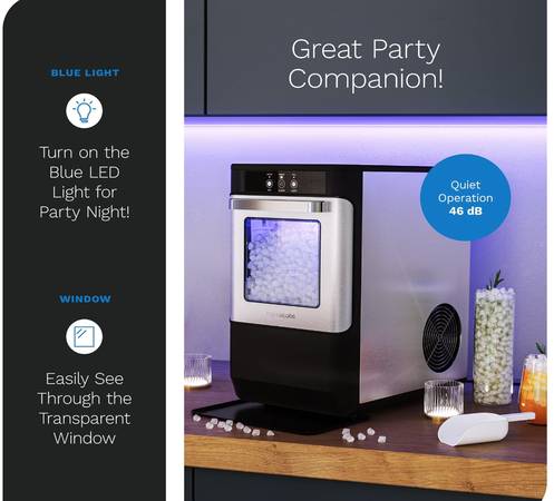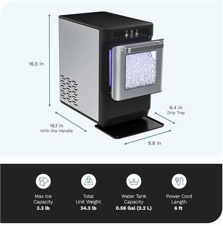 The hOmeLabs Countertop Nugget Ice Maker in Black with a Stainless Steel finish is an essential appliance for any home entertainer or simply for those who love chewable, restaurant-style ice. Producing an impressive 44 pounds of nugget ice daily, this compact unit ensures you'll always have a steady supply for cocktails, cold brews, or even keeping food chilled. Its intuitive touchscreen allows for instant ice production, just tap "ICE" for 9 fresh nuggets, and a transparent, illuminated window lets you monitor the 3.3-pound ice drawer with ease. Refilling is a breeze and its sleek design makes it a seamless addition to any kitchen countertop, ready to elevate your drinks. This ice maker measures 34 pounds and measures 16.1 inches long, 9.8 inches wide, and 16.5 inches high.