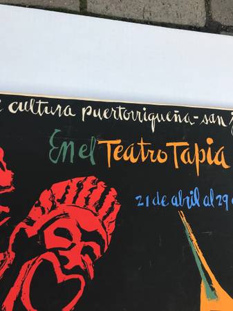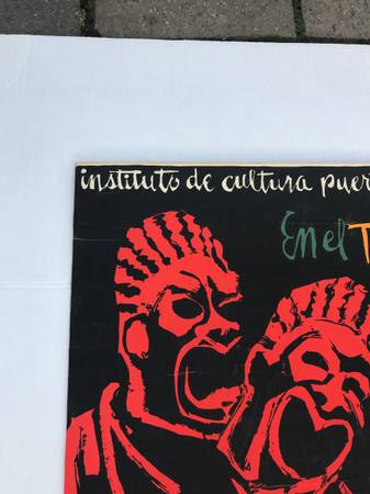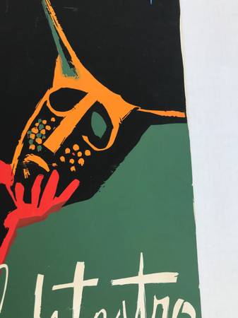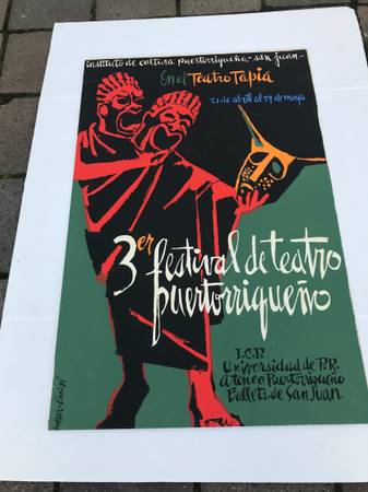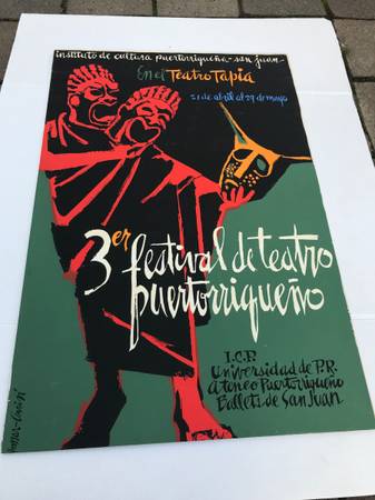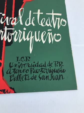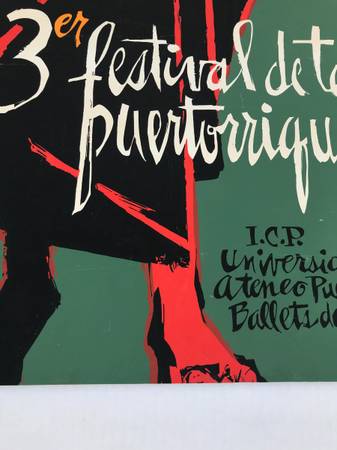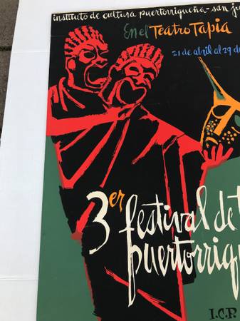 1961 Silkscreen on paper by Lorenzo Homar and Francisco Arrivi. I am pretty sure this is silkscreen on paper, most of his posters are. This was framed in the 70's but the glass was broken when I found it. The framer has glued the poster to a board / cardboard backing (not the large white background). I removed the piece from the frame to get rid of the broken glass, frame is in pretty good shape and included with sale. The poster has some small areas of damage. It also appears it was trimmed a little when framed, likely removing damaged edges. The annual festival began in 1958 which is how I arrived at the 1961 date. Overall piece is in very good condition.