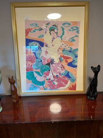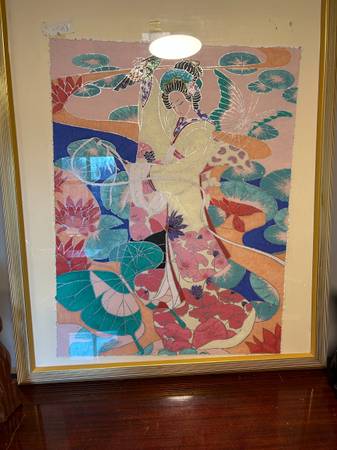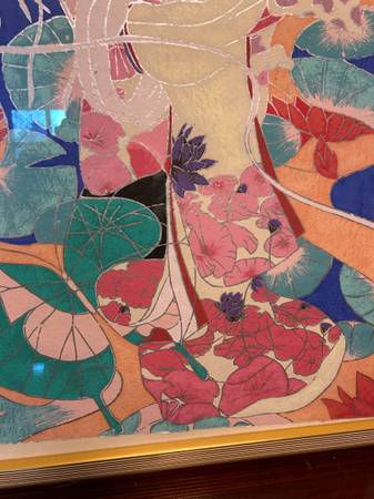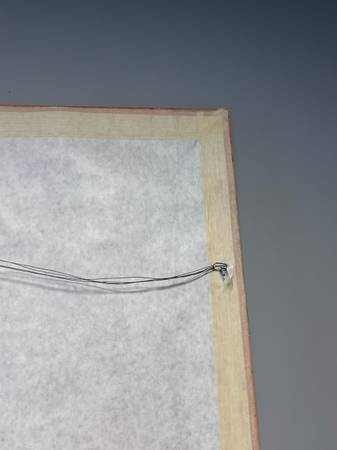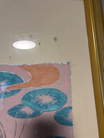 Mixed media framed piece signed James Lee. Piece is in pretty good condition. Edges of the actual art are tattered as though it was torn from a larger piece, I don't think this was an intentional look. I see other works by Lee that have this same look. Actual art has come loose in the frame and shifted inside. It would take a little effort to put it back in position but no damage has been done. Frame has some minor scuffs and scratches but overall excellent.