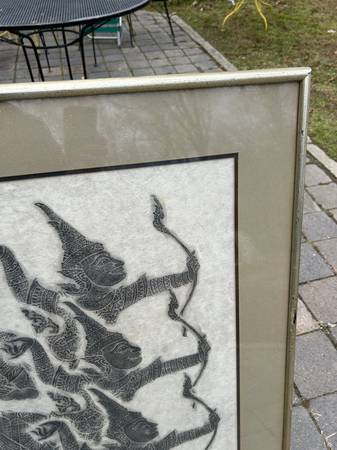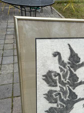 Vintage Thai / Cambodian temple rubbing. I don't really know anything about these, just copying what other sellers say. I liked the look of this one. Pretty sure it is rice paper. Piece is in very good condition. There are some slight moisture stains I show in the photos. Frame has some scuffs and scratches but otherwise very good.
