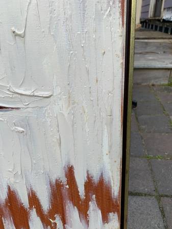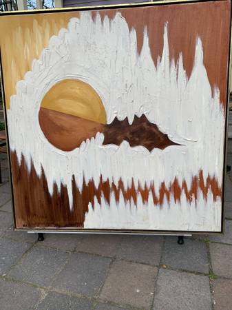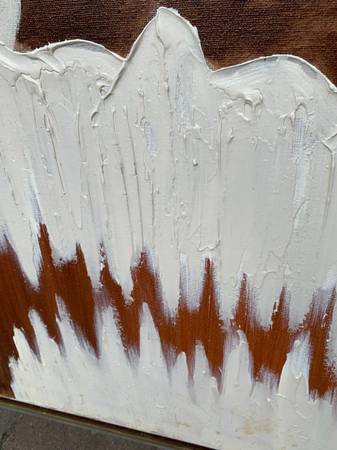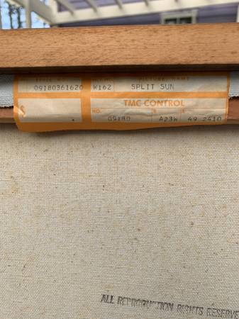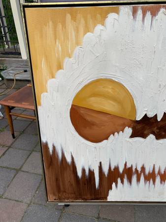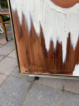 This mid century abstract on canvas is signed J. Keane. Piece is in excellent condition. It has the TMC, Turner Manufacturing label on the back with the title. Frame has some wear to the finish. There may be a slight scuff or two that I missed but overall excellent.