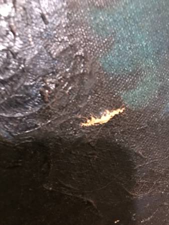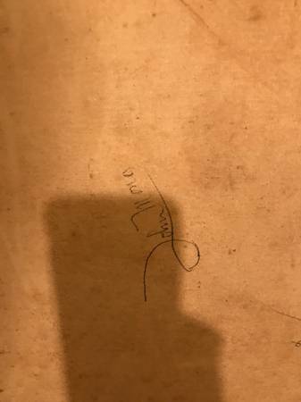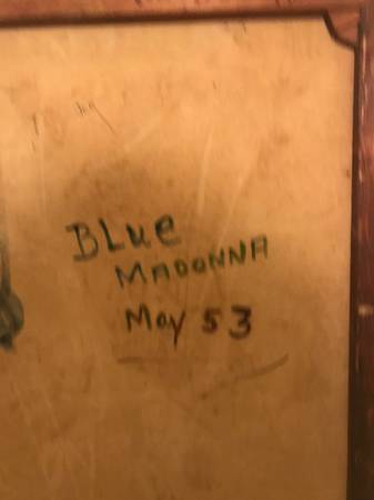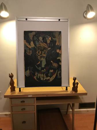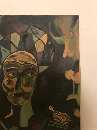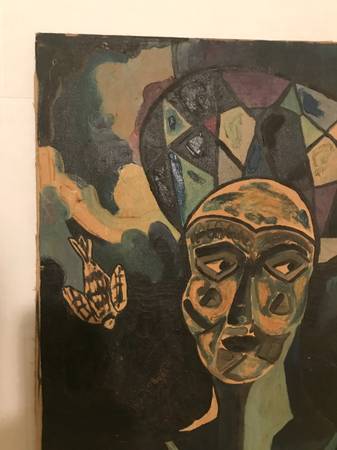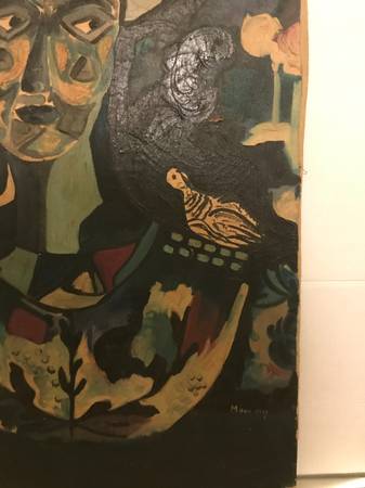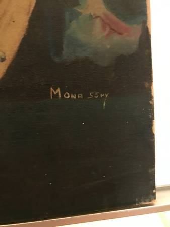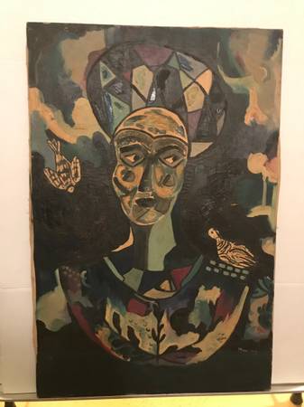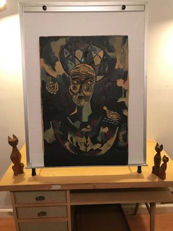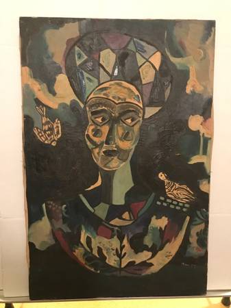 Unique original signed mid-century abstract. This abstract is signed John Mona 1953. It is a little beat up but I think it is awesome, so the price reflects that. The eyes do follow you so if you are carrying a lot of unresolved guilt this may not be the piece for you. There are a few small tears in the canvas most of which are not visible when hung on the wall. It is a multicolored sort of busy color scheme so a small repair would be easily hidden. It needs cleaning and repairs but quite a statement piece.