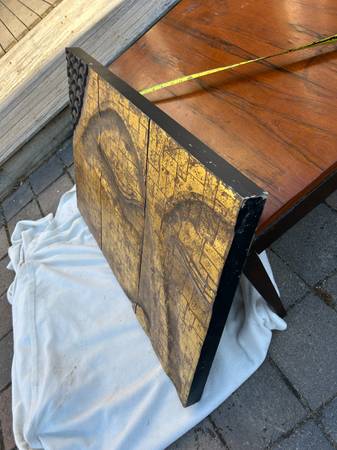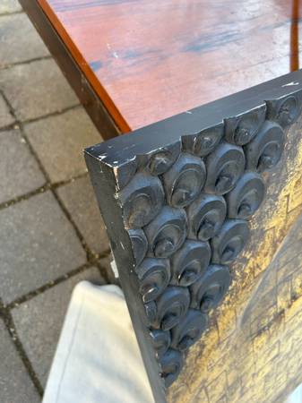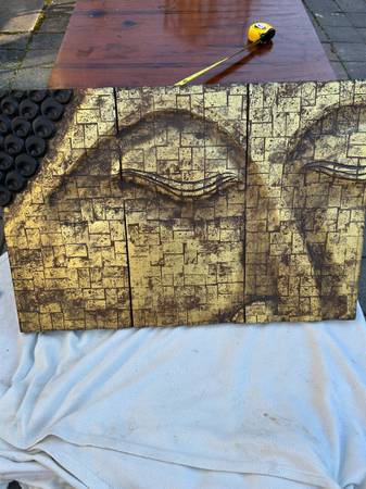 Pier One Imports carved face of Buddha wall hanging. Piece has been in storage and black frame is a little chipped up. It needs a good cleaning but otherwise pretty good condition.