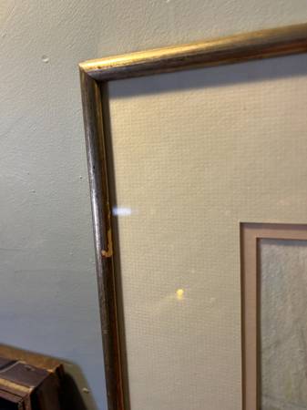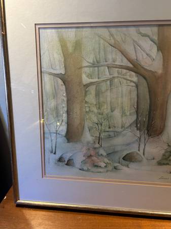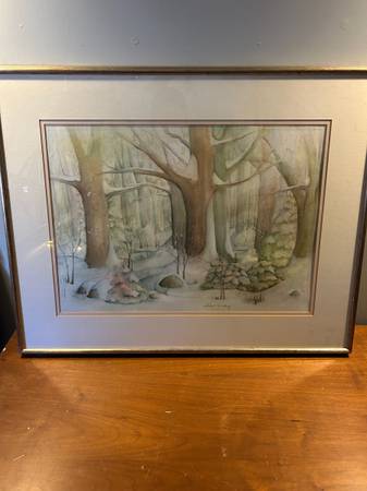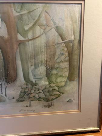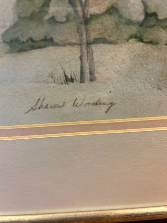 This original watercolor is signed Sharon Wooding. Piece is in excelllent condition. Frame has some very slight scuffs and scratches. Piece is a little dusty from storage. Overall excellent condition.