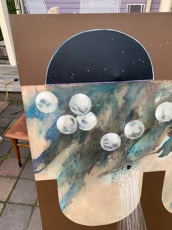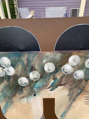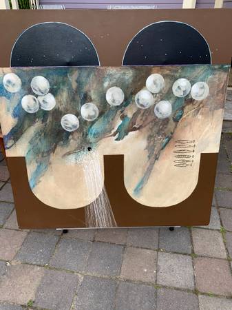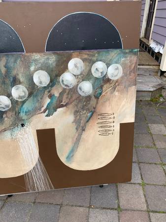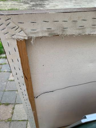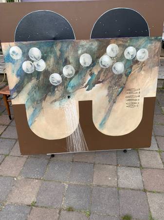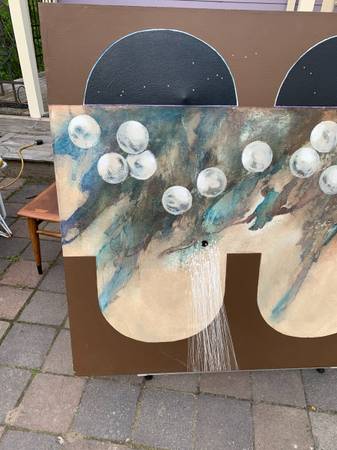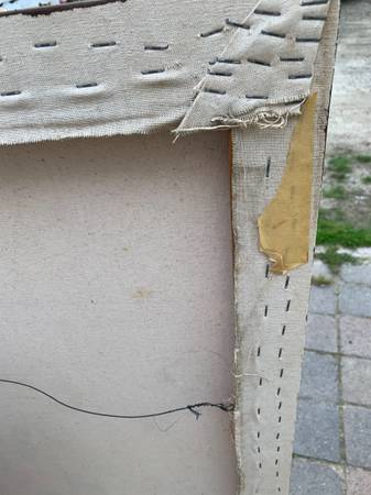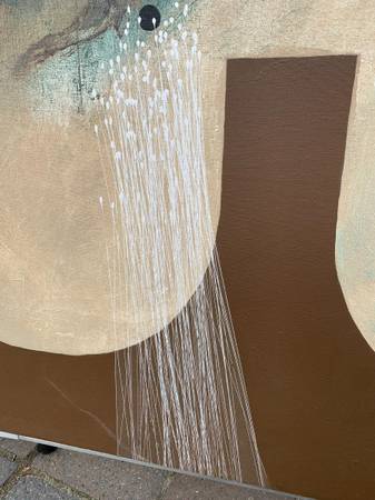 I think this is acrylic on canvas but I don't really know much about art. Previous owner said it was in his parents' vacation home when they bought it in the 70's but I think it has an eighties look. Piece is not signed or marked in any way. It has a cool look. Piece is in very good condition. The two dents in the canvas were something behind it for the photos. There are two very small pinholes I show in the last photo. There is chalk or something white that shouldn't be there in a few spots. There may be a slight scuff or two that I missed but overall very good.