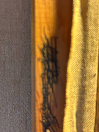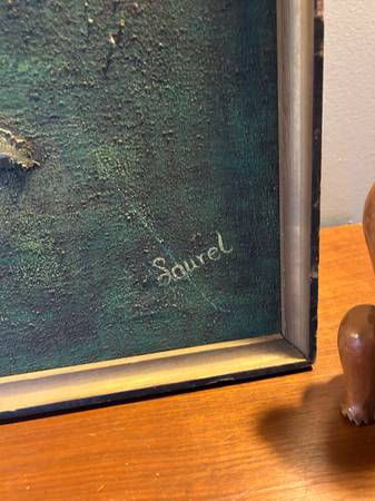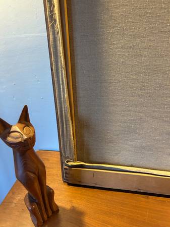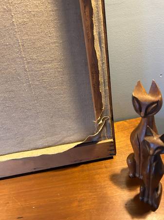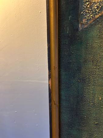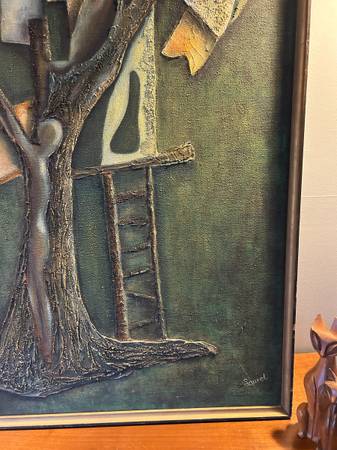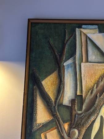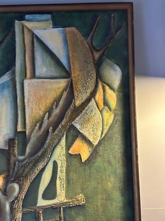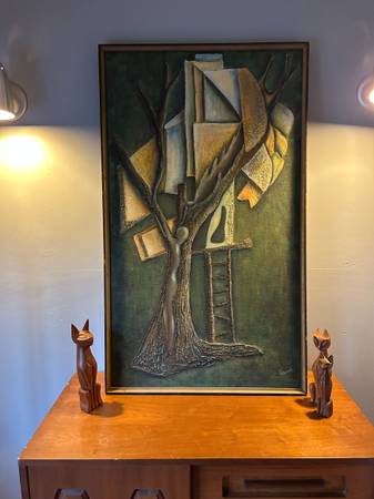 Fantastic mid century abstract. Some sort of multi media. It is titled on the back "The Tree House" with the full artists name. Painting is in excellent condition. The wood frame is a little nicked up. Overall excellent condition and quite a striking statement piece for your collection.