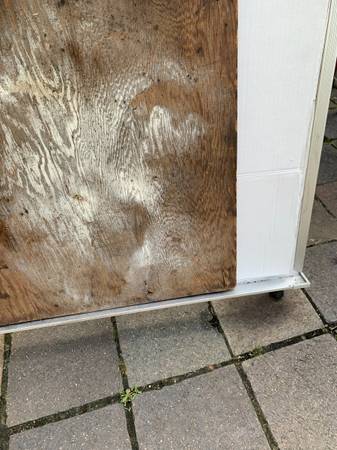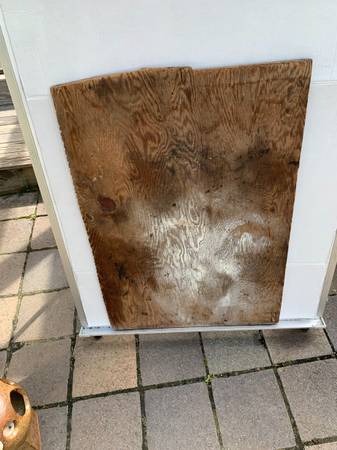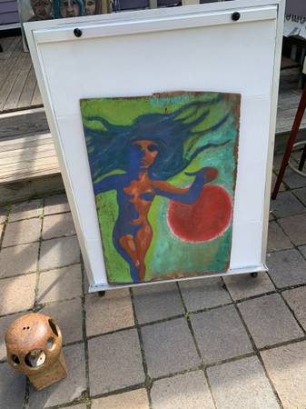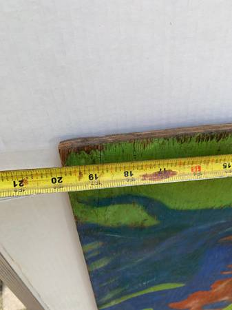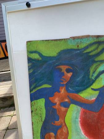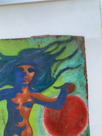 Primitive (very primitive) oil on plywood scrap. It's from the late 60's early 70's and has some wear. There is a hole where it was nailed to the wall. I thought it was an interesting look.