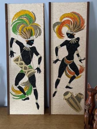 (2) Vintage gravel / sand art wall plaques. I think these are colored plastic bits, not sand or gravel. Pair is in very good condition. One side of one frame is missing and the remaining one has some damage. If I have these long enough I will reframe them. Each has a a few minor scuffs and scratches but overallgood condition.