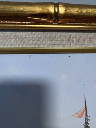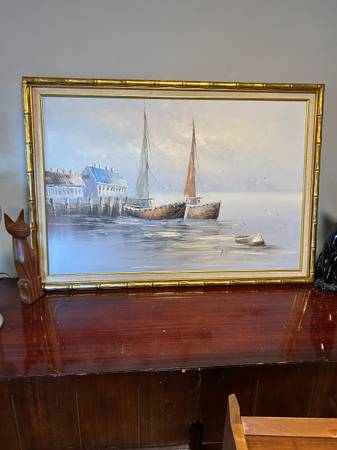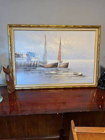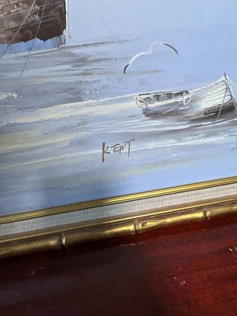 Vintage oil on canvas signed Kent. Piece is in good used condition. Frame is pretty new. The previous owner attached a hanger in the wrong spot and put two small nail holes through the canvas at the top. Aside from this obvious flaw piece is in pretty good condition. It has some dust but overall pretty good .