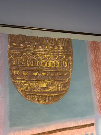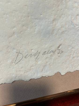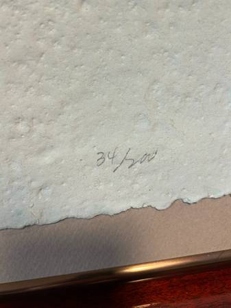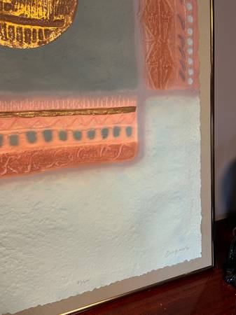 Mixed media numbered modern framed piece signed but illegible. Piece is in very good condition. Corners of metal frame have some small gaps. Frame has some scuffs and scratches but overall very good condition.