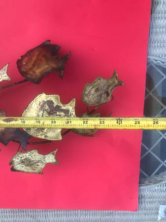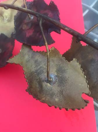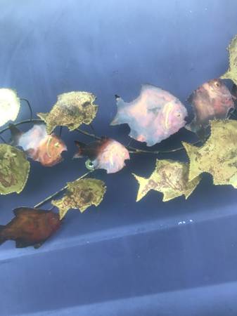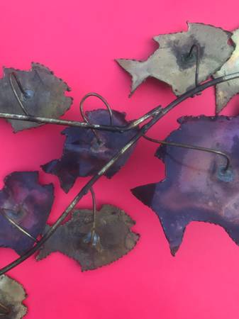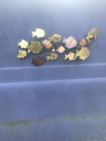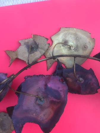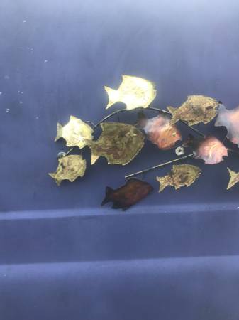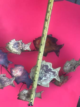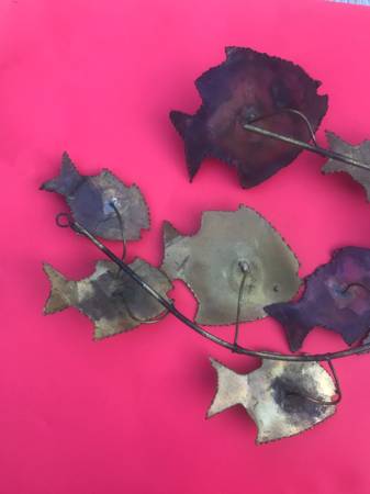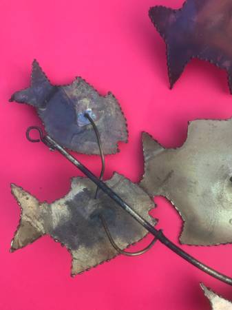 Torch cut wall sculpture which is not marked. I looked pretty closely and couldn't find any signature. Metal has a few little dents and dings but overall like new. Fun little fish faces whomever it is by.