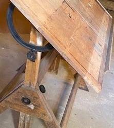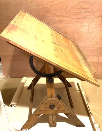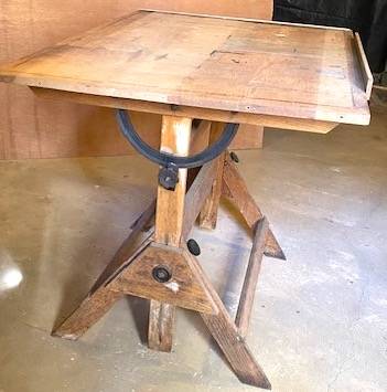 Fully functioning and still inspiring, this period piece may have been built sometime in the early 20th century, and may be considered antique. I have had it about 45 years and believe it is a Dietzgen table. It has old paint stains on it but the paint has not been analyzed. The table stands firmly and does not wobble. It tilts to a comfortable angle and is adjustable in height.