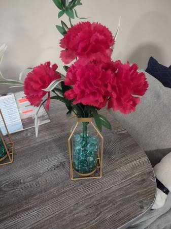 Lantern vases with Flowers, Colored Beads, and Green Foliage.