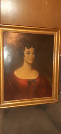 Large framed vintage portrait of woman with dark hair in red dress "Barbara Dean" written on back mysterious, striking... $50 OBO