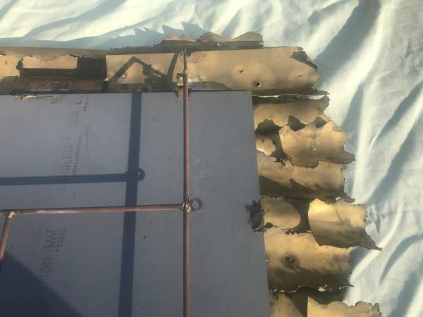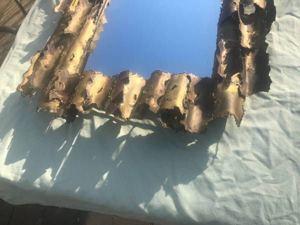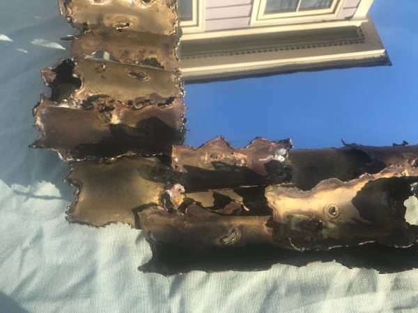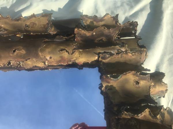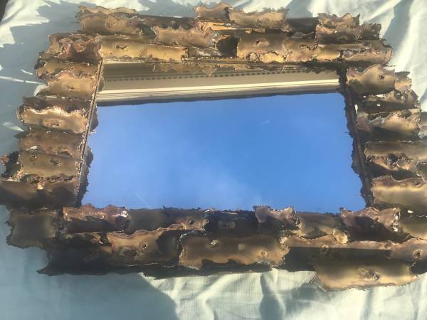 Tom Greene style Brutalist mirror by Iranian / Israeli artist Isaac Zarabi. I couldn't find a signature on the piece itself but the previous owner had it since new and the descriptive letter was always attached to the back. She said she re-typed it in the late 70's when she saw the original was becoming illegible. Piece is in excellent condition. Mirror has some scratches to the backing, where the bracket scratched it. The weld on one of the brackets is detached. Overall piece is in excellent condition.