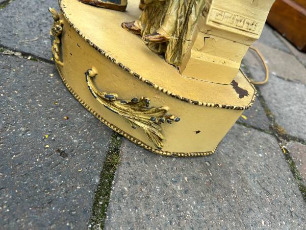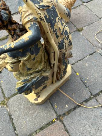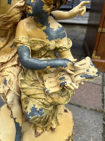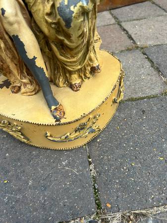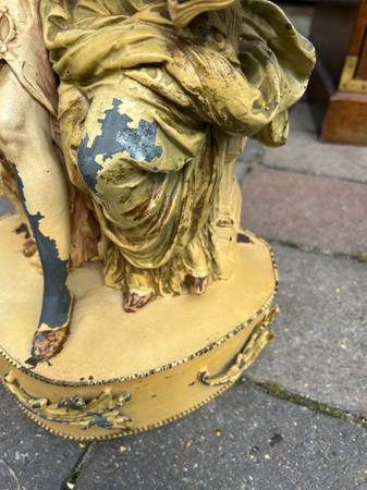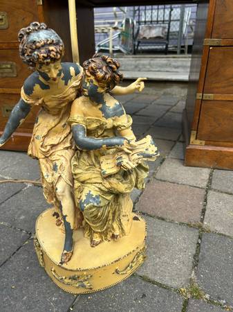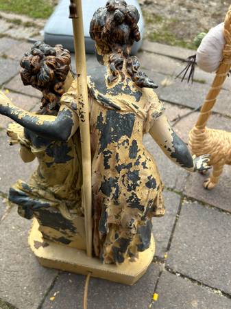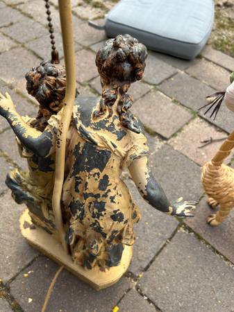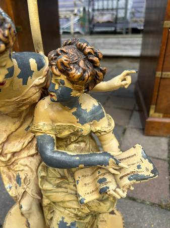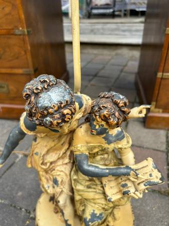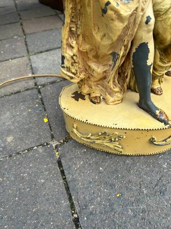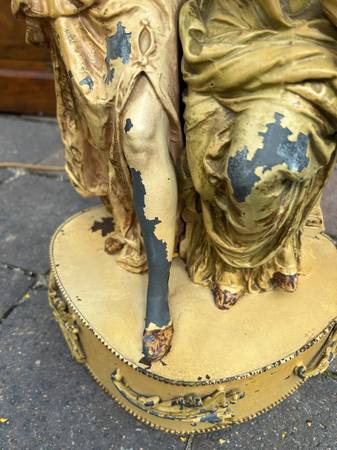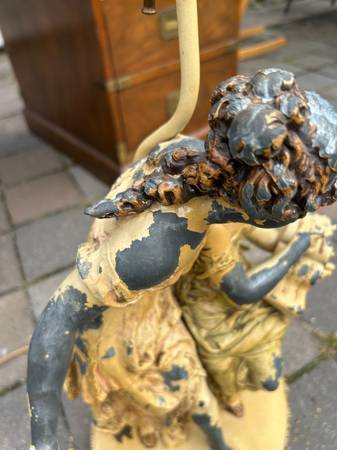 Unique fixer opportunity Art Nouveau figural lamp. Aside from the obvious paint situation lamp is all there, working and in very good condition. No missing fingers or chipped locks of hair. Finial is in excellent condition. Obviously needs some cleaning up but a very unique older piece.