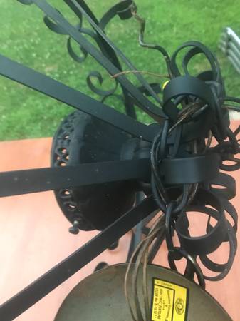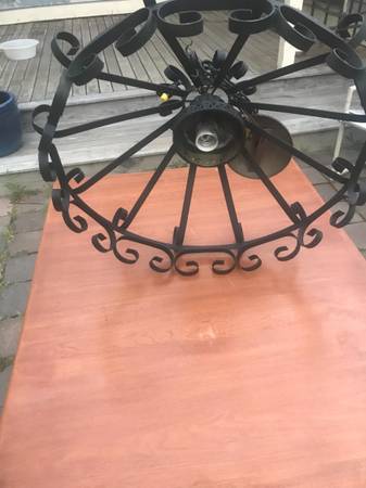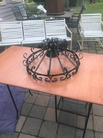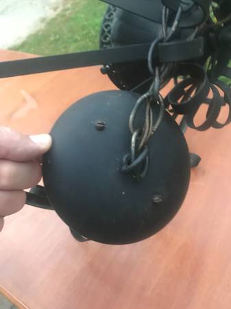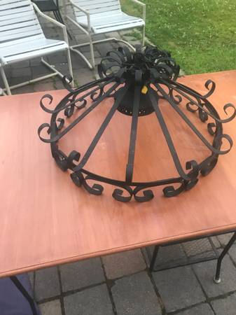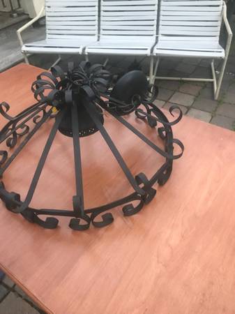 This chandelier is not marked but in the style of Arthur Umanoff and from the same era. Looks almost exactly like the Granada patio chairs by Umanoff. Light is in good used condition. It looks like the previous owner recently repainted the black and didn't do too bad of a job. I would rewire it if it were mine, it's older than me and my functioning is sketchy at best. Overall light is in very good condition.