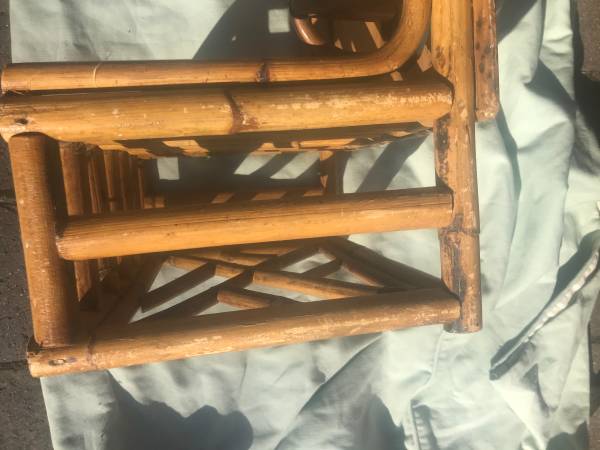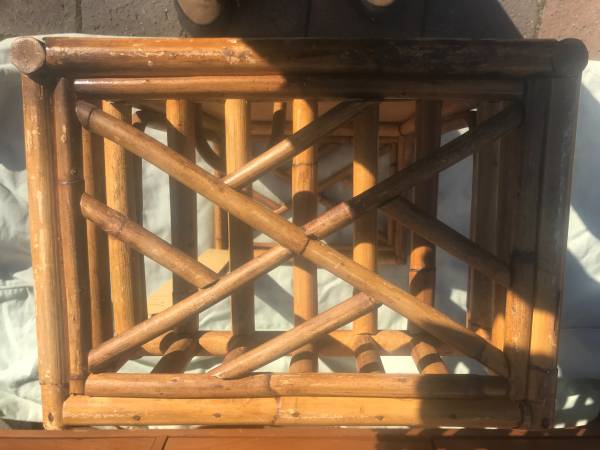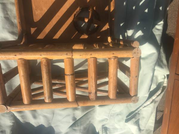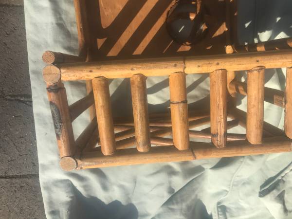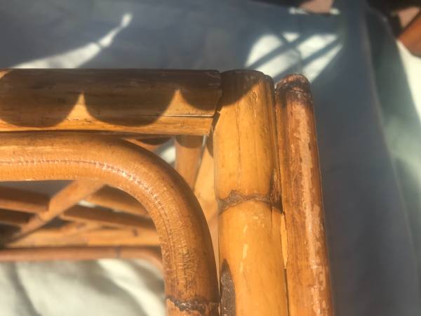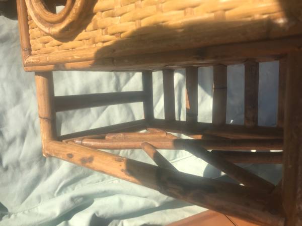 Vintage rattan and wicker breakfast in bed tray. Piece is in good used condition. One leg / side piece has curved in a little, presumably shrank with age. There is a small split in one of the rattan pieces where this curved leg joins. None of the affected parts are loose. Piece could use a careful cleaning but overall very good used condition.