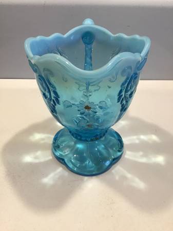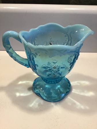 Beautiful antique intaglio blue leaf and flower opalescent glass creamer made by the northwood glass co… 5” tall and 6” from handle to spout… very old very beautiful…$40.00