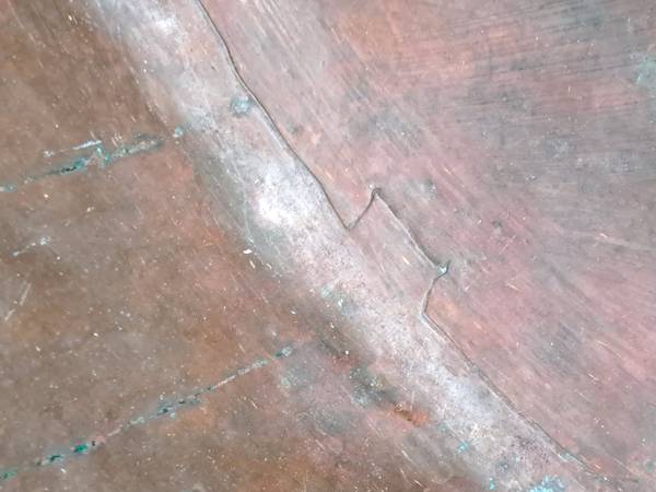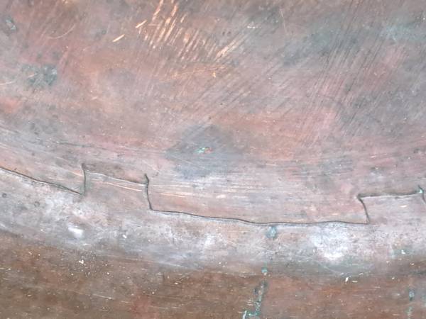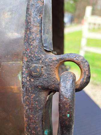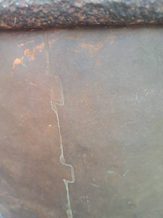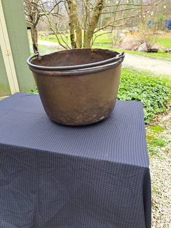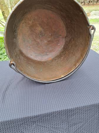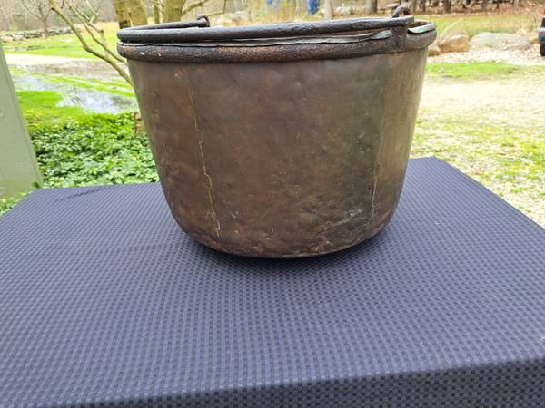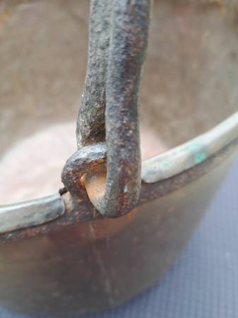 Exceptional condition / construction copper cauldron with dovetailed bottom and sides . The handle is attached to an iron hand forged ring that surrounds the cauldron top which is hammered over this ring. (PLEASE VIEW PHOTOS).