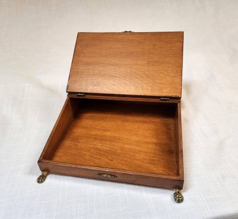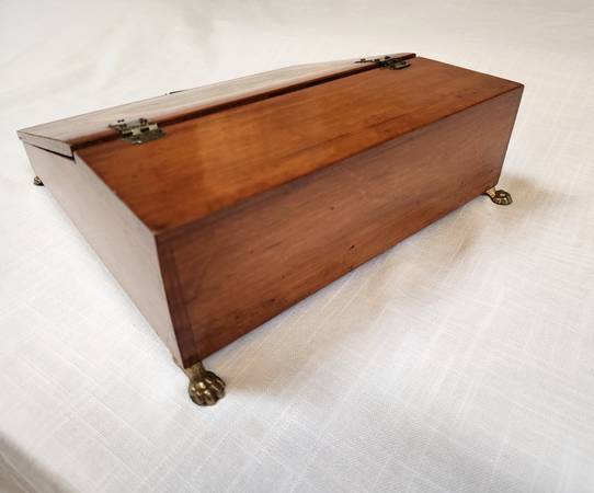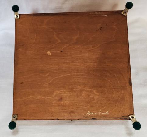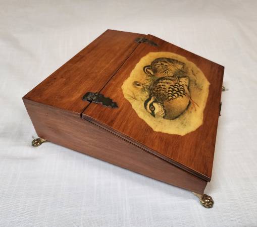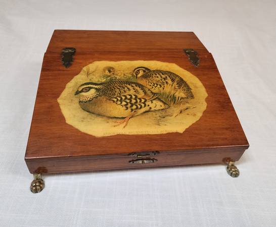 Signed vintage wooden trinket / letter / jewelry lift lid decoupage box. Features a pair of white cheek partridges (Arboricola Brunneipectus Albicula printed below picture). Brass feet and accents. Signature on the bottom. Lid latch does not clasp. Great condition!