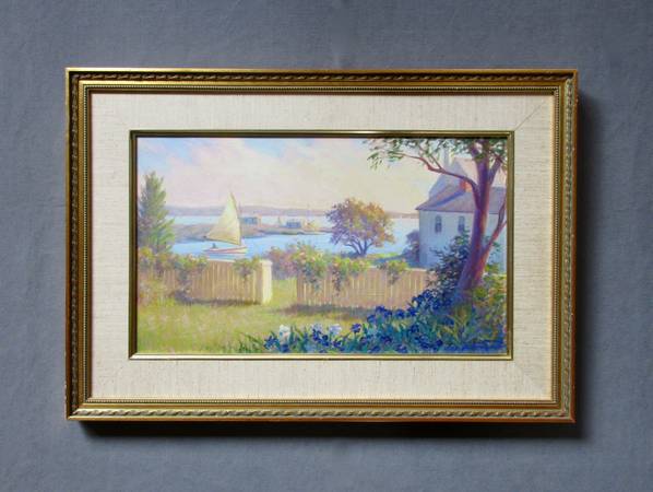 Welcome. For your consideration is an original vintage oil painting of a coastal landscape by well-listed Provincetown, Massachusetts artist Ernest G. Principato (1945-). This impressionist oil painting was completed on a panel and signed by the artist on the lower right, E. Principato, '79. There is a label on the back with the title of the painting "Summer Sailing" and the artist's signature and date for the painting 1986. The artist was painting in Provincetown, Massachusetts around the time of this painting. It's likely that this coastal landscape was completed somewhere on the Cape Cod, MA shoreline. In it, the artist uses all his mastery of colors to bring this painting to life.