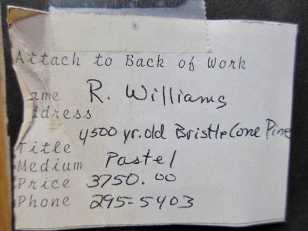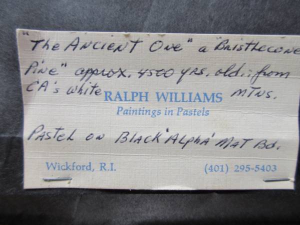 The pastel painting was completed on a black "Alpha" mat panel and signed and dated by the artist on the lower right, Ralph Williams 2/13/1988. The painting also has an original exhibition label on the back. The label does not indicate what exhibition it was entered into but the artist was known to have exhibited at the Wickford Art Festival in Rhode Island. The label also has the artist's name, the title of the painting "4500 year old Bristlecone Pine" and the original price of $3750.00. I've had the good fortune of acquiring several Ralph Williams paintings directly from his estate. In my opinion, this particular painting, out of all the paintings the artist kept for his own private collection, is the best one I have ever seen!