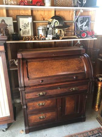 Antique Cylinder Desk 1800’s good condition. Cookie cutter design on top of the desk . 35” long 23” wide 98” Tall. No delivery or shipping. Cash Only. Beautiful piece of furniture. Top part of desk...