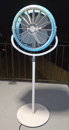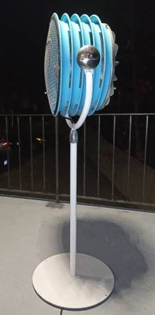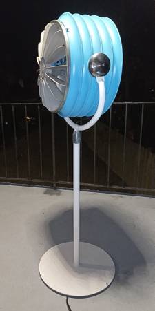 All original fan works perfect. It runs smooth powerful and quiet. Rare aqua and white color combination. The base is solid steel with solid steel feet. It has 2 speeds. It also extends up and down plus it swivels and tilts .