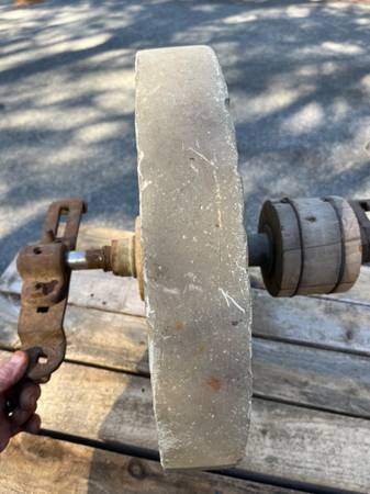 Antique sharpening stone with wooden flat belt pulley and mounting brackets. The wheel measures 18” in diameter and 3” wide. Asking $100. If interested, please Text Jim.