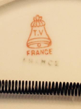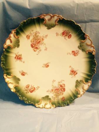 T V France Limoges plate from the early 20th century with roses and green trim. The plate measures 12" in diameter. It is marked T V France Limoges on the bottom. If interested include a contact...