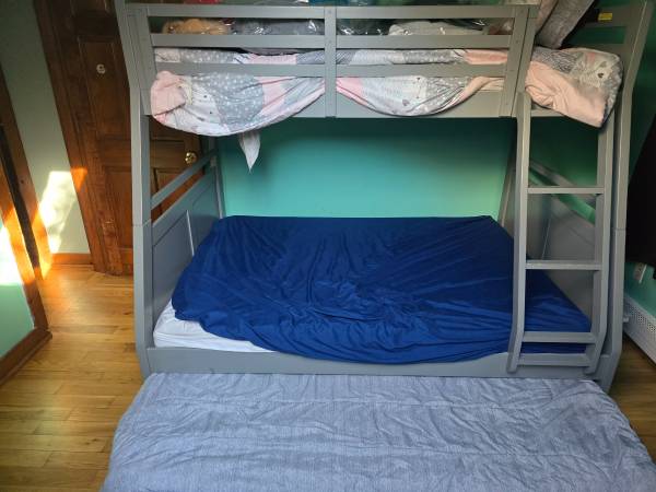 Rarely used bunk bed with trundle mattress are spotless covered with protectors from day one