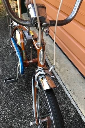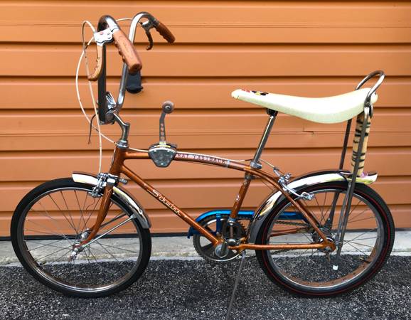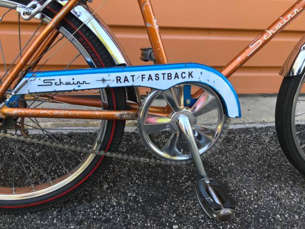 1967 Schwinn Sting-Ray Rat Fastback bike muscle bicycle with S-7 rear wheel with fat gripper slik tire and S-5 front wheel with skinny fastback tire. 67 coppertone fastback frame/fork, schwinn hurricane chain guard , S-5 front wheel with USA fastback tire, rear S-7 S/A 3 speed wheel with USA Gripper Slik, Custom S/A Rat Stick Shift, Schwinn: mag sprocket gooseneck bow pedals sissy bar seat post and clamp; unknown brand wide apes, fenders and white glitter banana seat and amber reflector, schwinn coppertone chubbys, new KMC chain, front/rear caliper brakes and hand levers, new cables and distressed cable housings. Most if not all hardware is correct Schwinn. Distressed auto decals from that time period. Bike has been cleaned and greased, ready to ride.