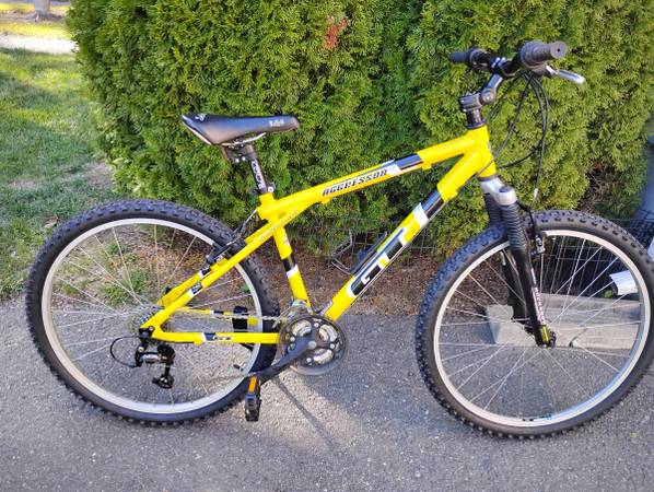An Aluminum frame 26 in GT mountain bike, Aggressor 1.0. With 24-speed Shimano Derailleurs. RockShox front fork suspension. New Kenda 26x2.125 tires, and new twist grip shifters and hand grips. In excellent condition V brakes and new chain. Pivoting handlebar stem for upright or mountain bike position. A perfect teenager mountain bike or adult size with a 16 inch frame.