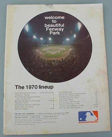 Offering the RED SOX OFFICIAL YEARBOOK 1970 shown which is 48 pages, front/back cover missing ,some edgewear and dogearred pages but overall good with some exceptional photos and information.... Neat bit of Sox memorabilia nonetheless...photos show actual item ..$5.00 please TEXT (617) 302-668two ..will arrange pickup in warwick