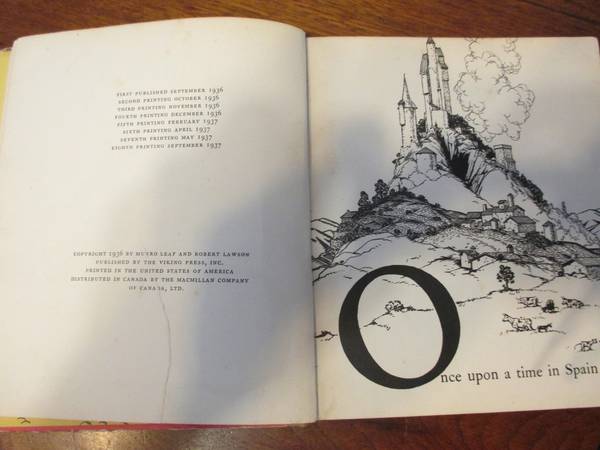 This delightful children's book is in very good condition. It has a slightly worn cloth binding but the entire rest of the pages are tight and intact and not affected by the condition of the binding. There is a small tear on the first page as seen in the photo as reflected in the reduced price. Each page is initialed by R.L. Publisher: Viking Press NY copyright 1936.This one I have is the 8th printing Sept. 1937. IT IS HIGHLY COLLECTIBLE AND RARE.