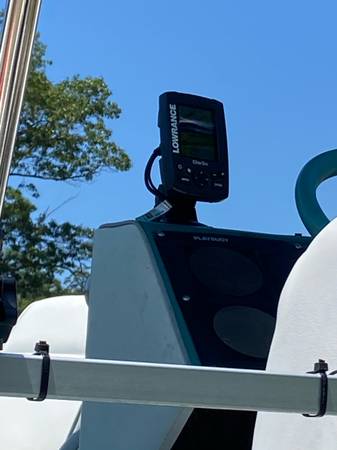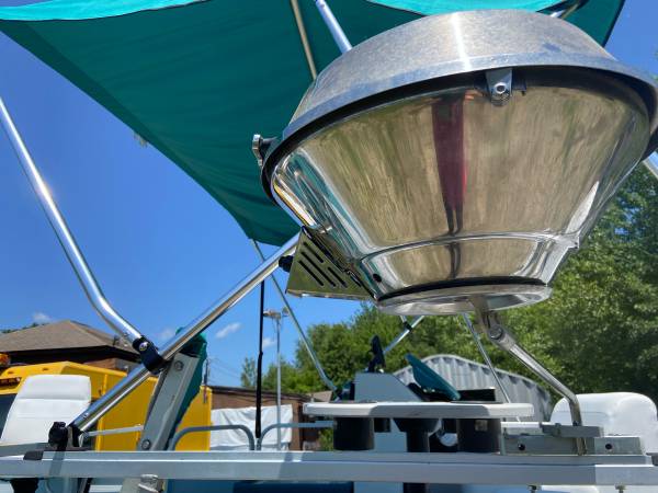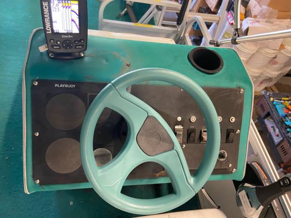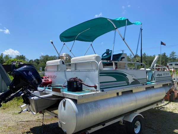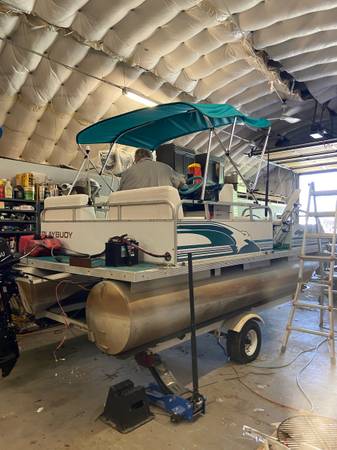 2). -16’ Playbouy pontoon boat with recently replaced new interior and brand new Bimini top,new lights, new foot controlled trolling motor, NEW fish finder, gas grill, swim ladder, skid free table with cup holders, back couches, front casting chairs, new lights
