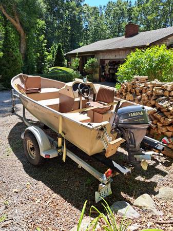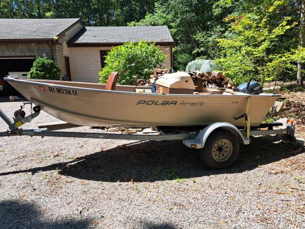 14' Aluminum Polar Craft wide boat. With 15HP Yamaha 4 Stroke . With Fin. 2 cushion seats, custom steering wheel, and AUX. motor mount. Boston Whaler trailer. Engine just serviced: call