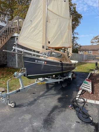 Includes: Boat, roller trailer, Honda 2.5 HP motor maintained by marina each year, carbon hinged mast, cream colored sails, fully battened main sail, roller furling jib with jib boom, mizzen boom, UV strip on jib and mizzen, dyneema standing rigging, fixed headstay, teak: bow sprit, gunwales, rub rails and seat slats, stainless steel cap on centerboard and rudder, Coppercoat bottom paint applied in 2024 (rated to last up to 10 y ears), Sunbrella: collapsable Dodger, Jib, Main and Mizzen sail covers, mooring cover, sails professionally cleaned, boat and trailer are registered. Purchase price when new in 2015: $41,800. Asymmetrical Spinnaker and rigging available to be sold separately. Boat was stored in a warehouse and not used between 10/2015 - 6/2022. Will deliver in Metro NYC, CT, RI, MA and Metro Portland ME