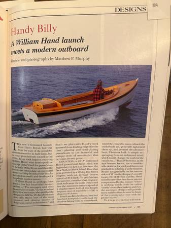 Between April and August of 2001, WoodenBoat carried a 3 part series, “Building the Motor Launch Handy Billy.” The plans and building manual were ordered by an accomplished woodworker. The Wooden Boat issues plans and manual are available as well as all materials receipts. First launched in 2002, she has been garage kept and used lightly.