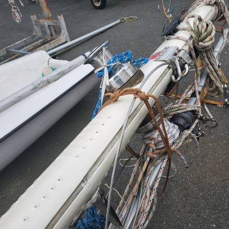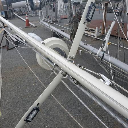 Replaced the Mast, with all new shrouds and all internal wiring and mast hardware (some used from other mast) with 2 LED Spreader flood lights, all brand new Shrouds and turnbuckles, new antenna and all new mast lights, wind vane, etc Also installed a "Mast Spinnaker Rail track", included is a 12' Pole and 21 s/s mast steps to the top. rewired completely. First class!