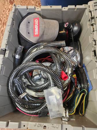 Don't know much about the stuff. Totes full of hose, aerator, cables, seat piston, rod n cup holders, trailer lights, hubcaps, battery tray, outboard power head, etc, etc. Lots of misc stuff if your...